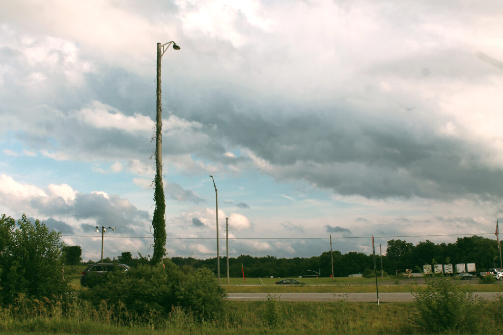 Traveling to Kansas for a residency my first night on the road was spent at a hotel on the border between Indiana and Ohio. This night’s sunset occurred between parting storm clouds and created a moment of compellingly dramatic light. Road trips offer this gift of being where you never knew to be. I use my camera as a way to get intimate with these spaces. I make images to craft meaning and memory out of these impermanent spatial interactions.